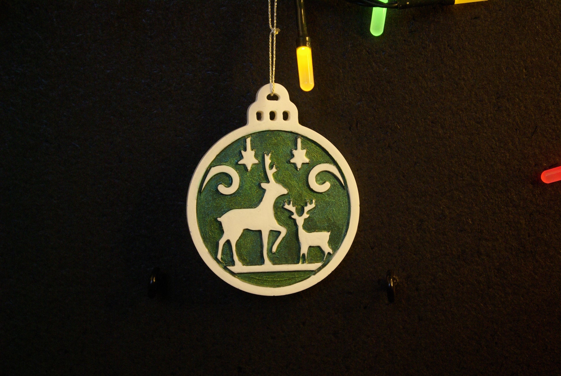 Une petite boule de Noël à décor de biche. Peinte à la main.