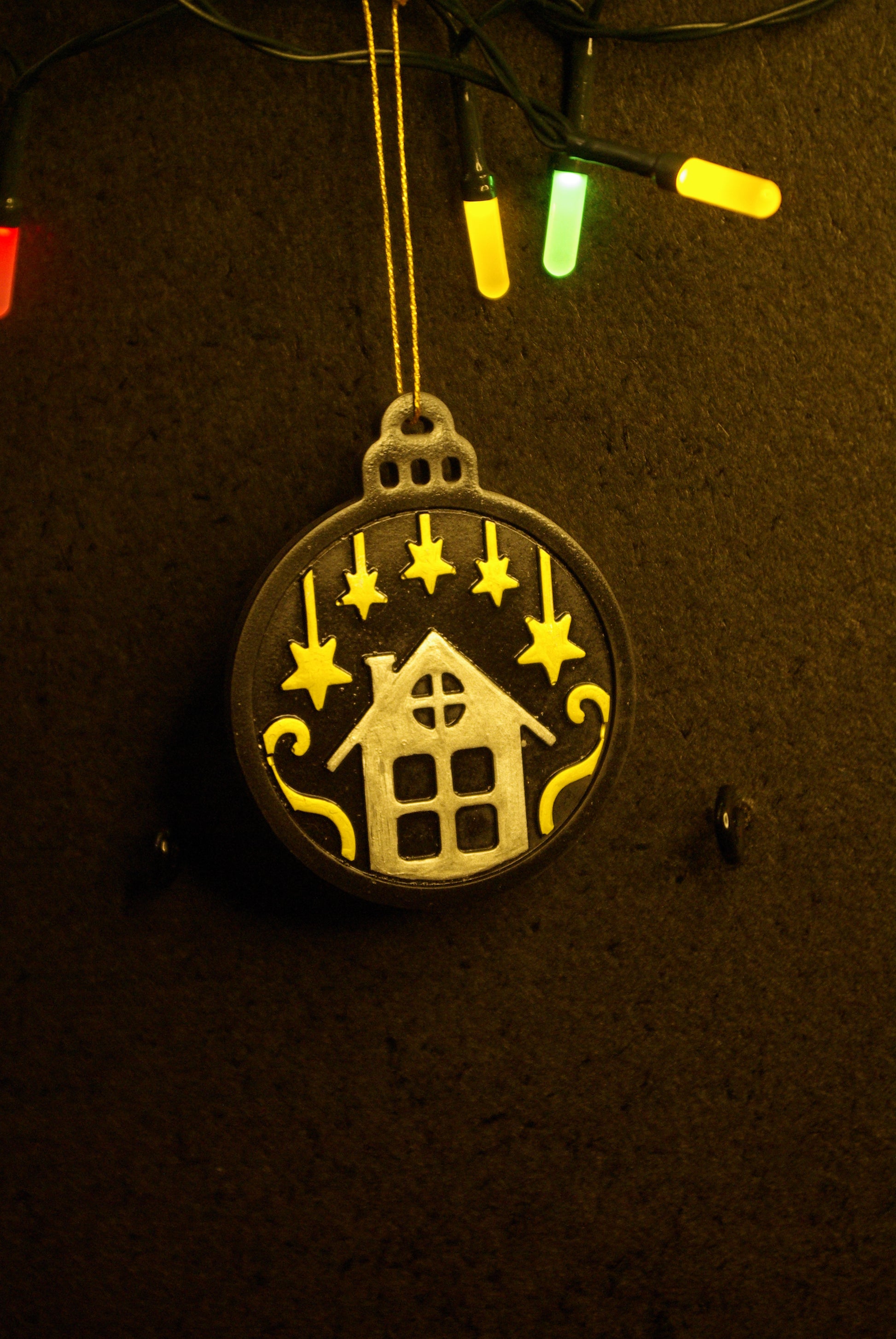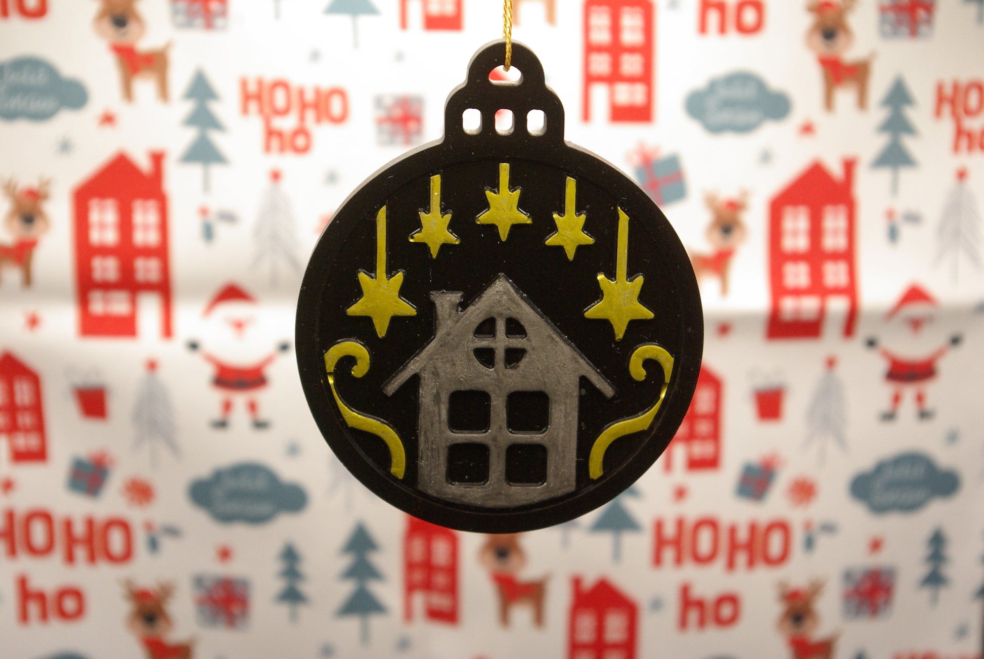 Une petite boule de Noël à décor maison. Peinte à la main.
