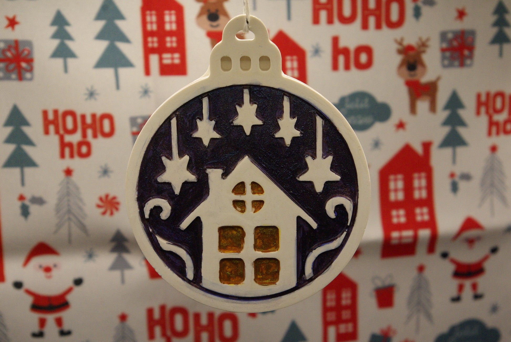 Une petite boule de Noël à décor maison. Peinte à la main.