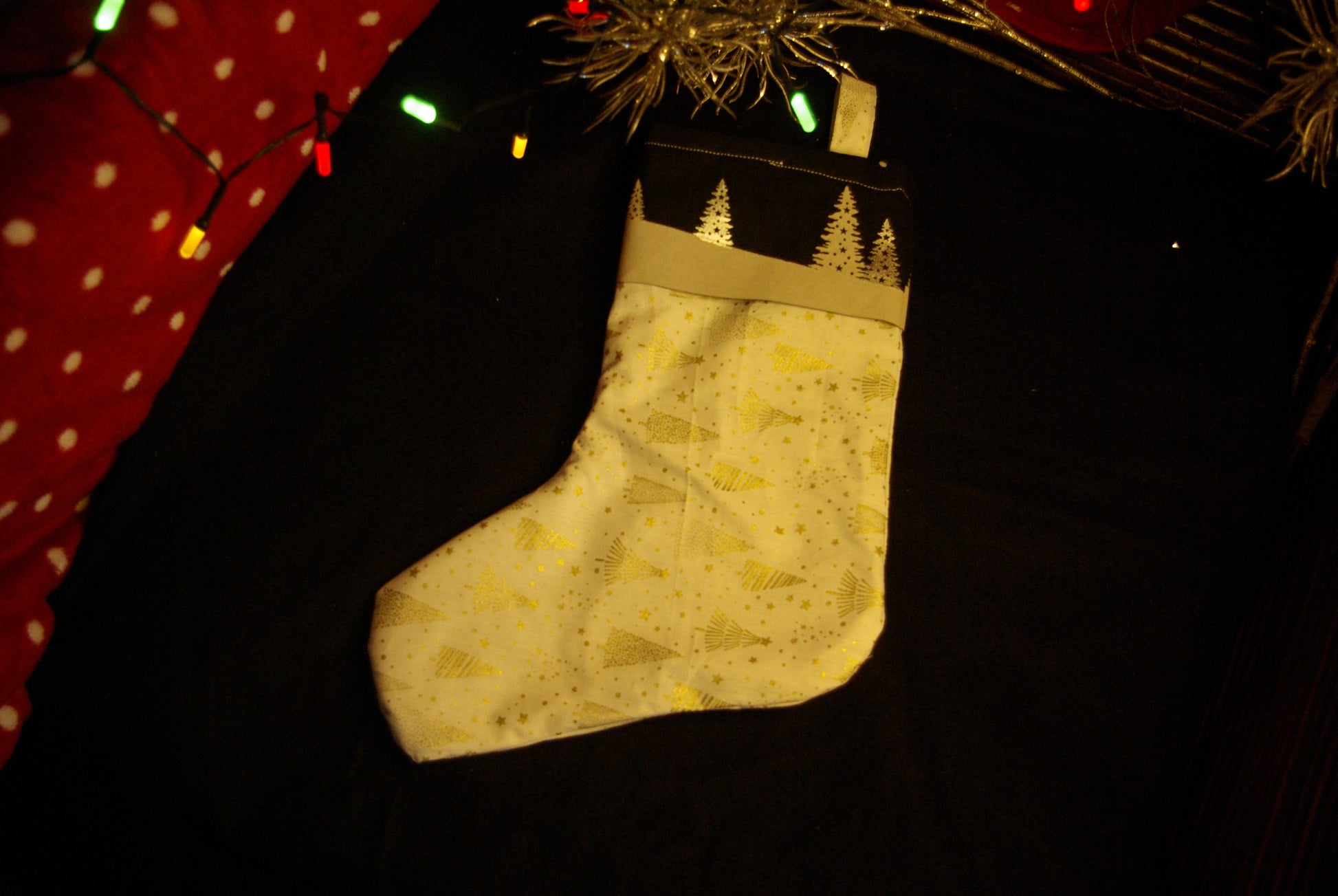 L'esprit de Noël sublimé par le tissus à motif de sapin doré.