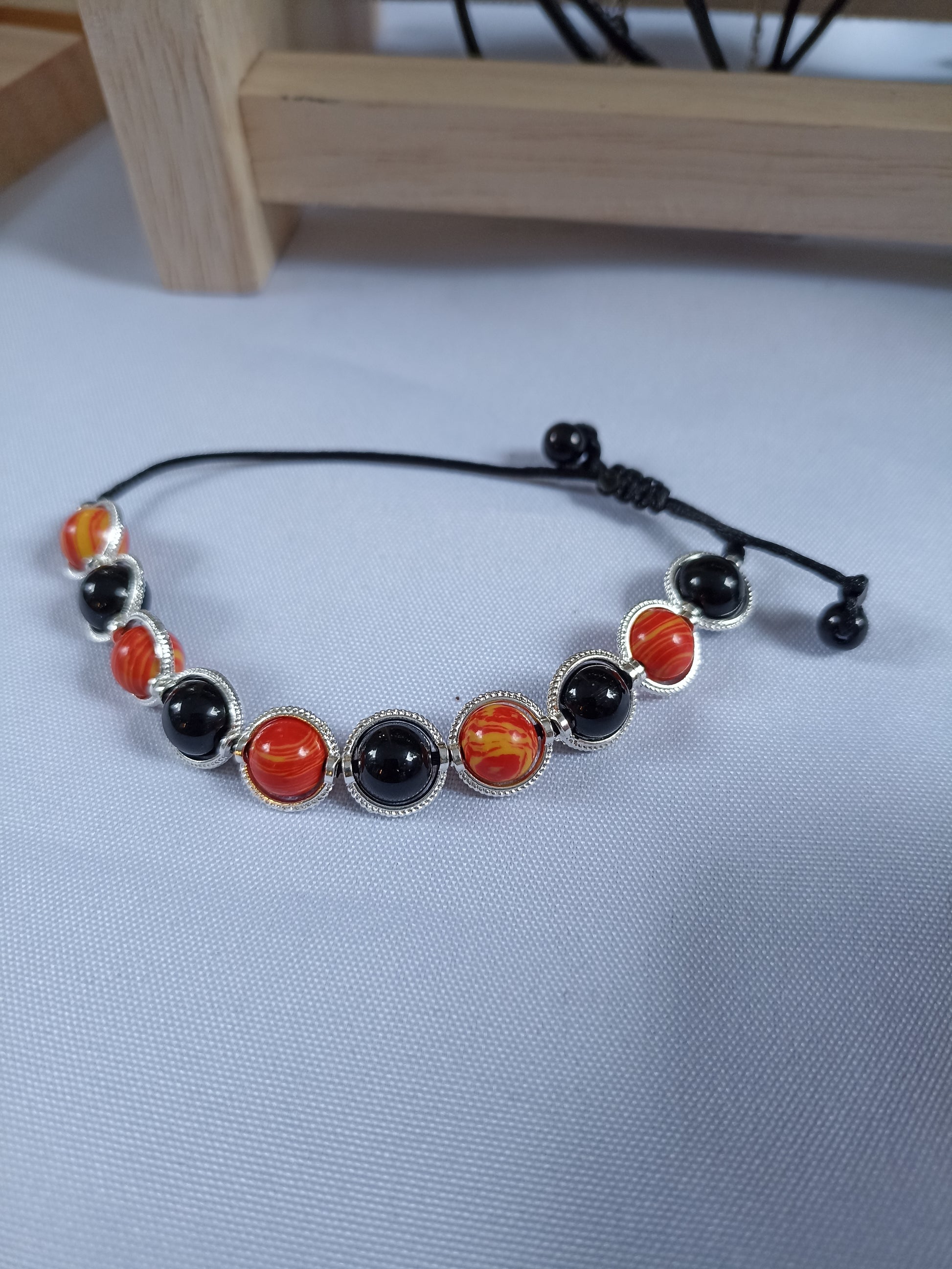 Bracelet avec des perles de pierres naturelles. Ajustable avec une fermeture en fils de soie noir.